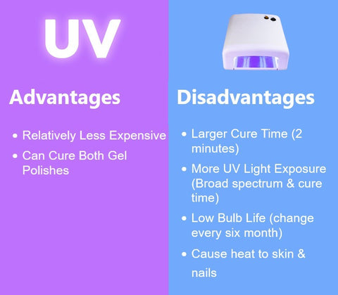 The main strength of UV lamp is its its broad UV spectrum which enables it to dry various types of gel polishes. It can cure all type of gel polishes while LED lamp cannot cure all types of gel polish. It is due to the broad spectrum of light UV lamp produces.