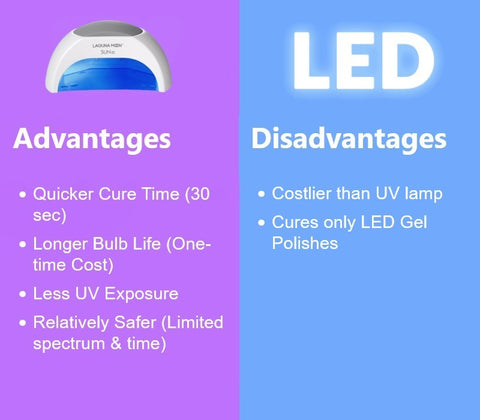 Main highlight of LED lamp is its fast cure time. Thanks to its narrower and more targeted spectrum which enables it to dry the gel polish very quickly. Usually, it takes only 30 seconds.