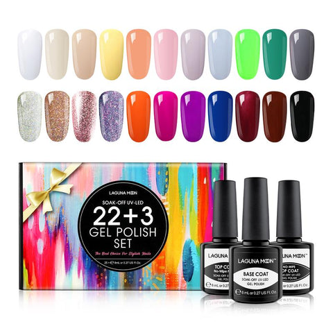 Unlike regular nail polish, Gel polish lasts longer. So it’s best to pick a color you will be happy with! Lagunamoon offers 6 color sets, 22+3 color sets and 24+6 color sets!